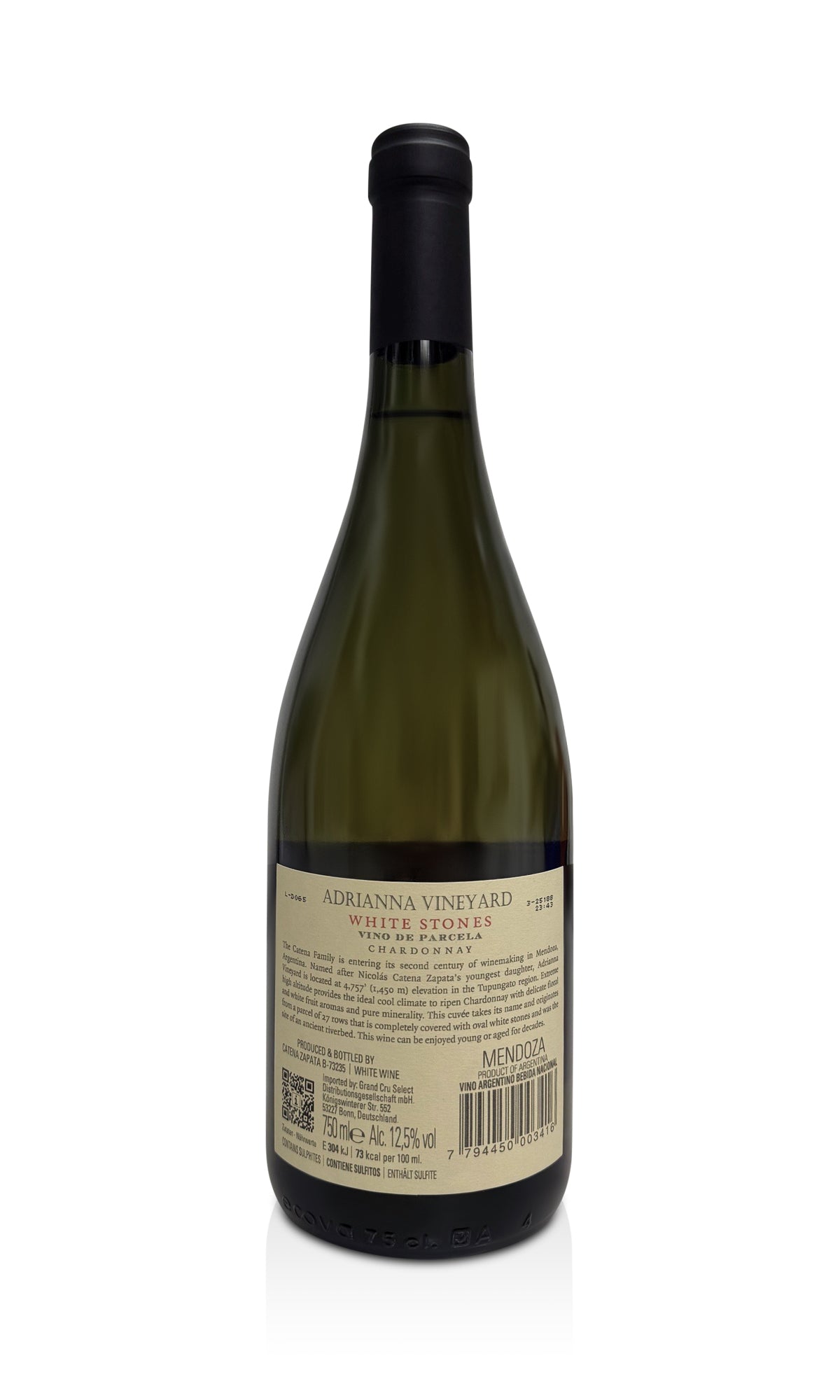 Die Trauben für den "Adriana White Stones" Chardonnay stammen aus dem Adriana-Weinberg, der zu den hochgelegenen Weinbergen in der Region Gualtallary im Valle de Uco in Mendoza, Argentinien, gehört. Die Gualtallary-Region ist bekannt für ihre kalksteinigen Böden, die dem Wein eine besondere Mineralität verleihen.
