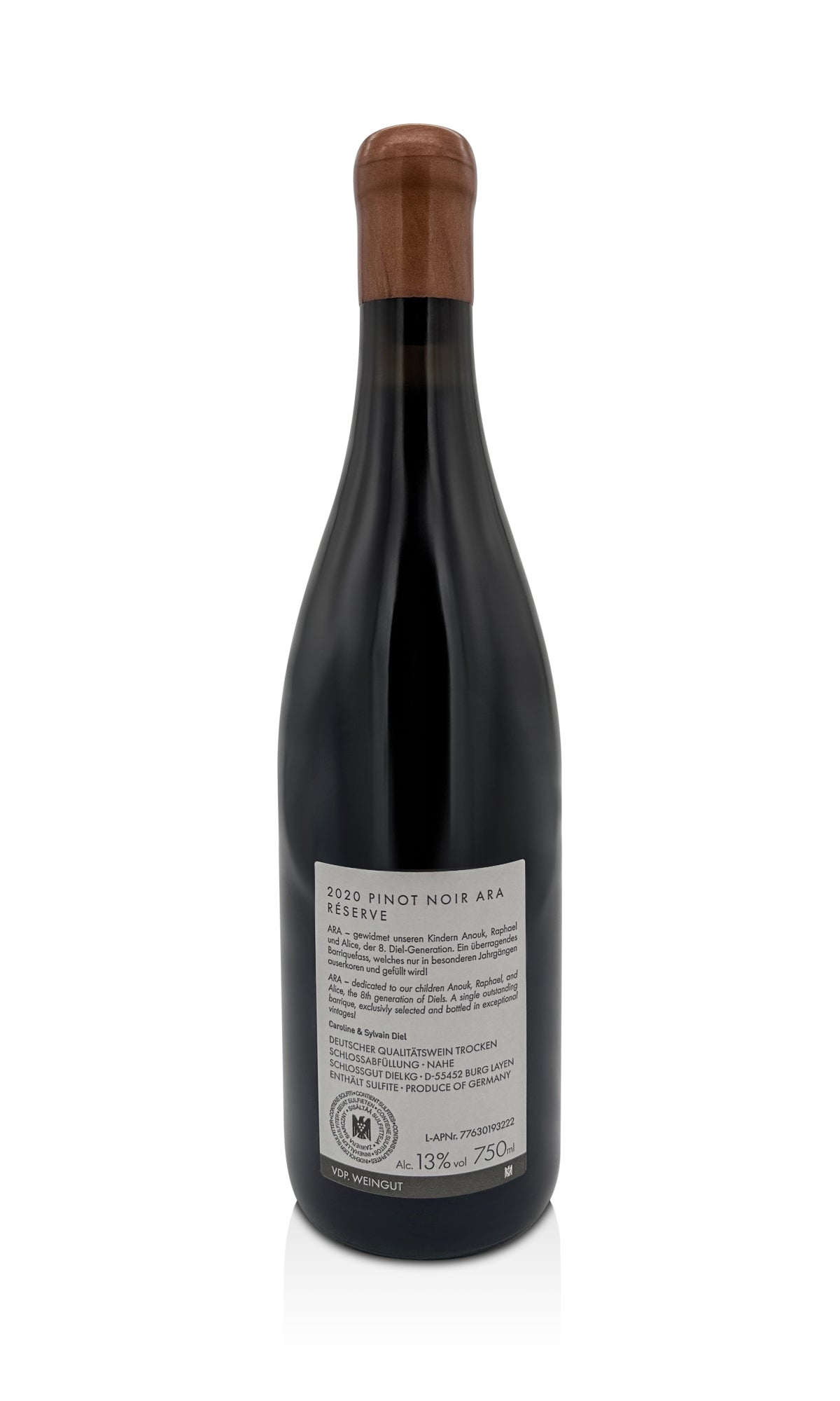 Der A R A Pinot Noir Versteigerungswein 2020 vom Schlossgut Diel ist ein eleganter, konzentrierter Pinot Noir mit sehr gutem Reifepotenzial. Bereits jetzt zeigt er Finesse, Struktur und Ausdruck, mit zunehmender Flaschenreife wird er weiter an Komplexität und Tiefe gewinnen und die Besonderheit der Lage A R A eindrucksvoll widerspiegeln.